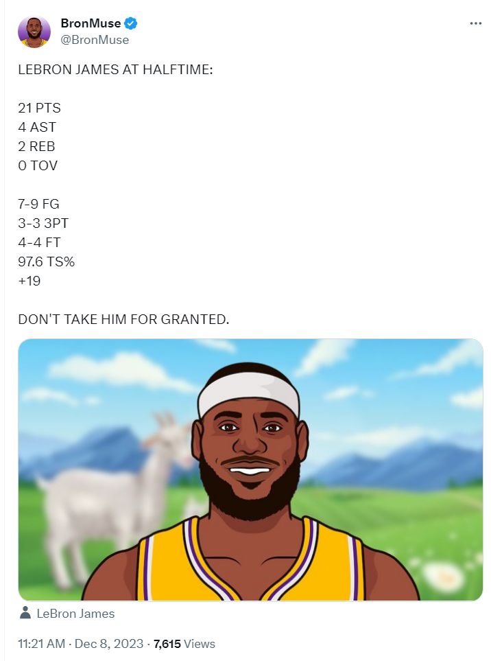 湖人媒体晒出詹姆斯,半场9中7+三分3中3,拿21+4+2+0失误的数据,又晒出了山羊的图盛赞他是GOAT。