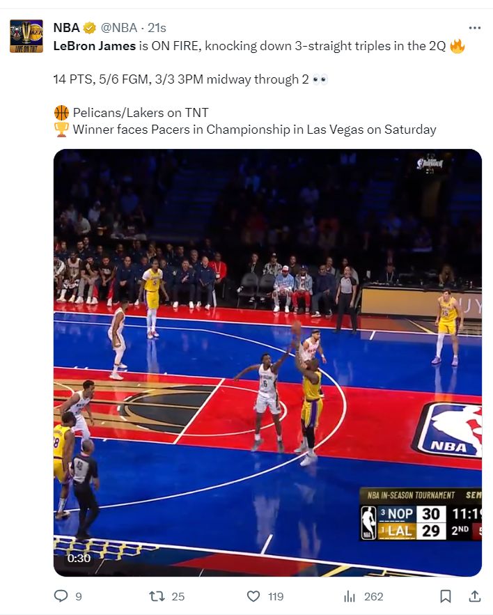 北京时间12月8日,NBA季中锦标赛,湖人吊打鹈鹕。首节湖人落后1分,半场湖人领先13分,第三节打完湖人领先39分,末节早早进入垃圾时间,鹈鹕与湖人末节都全替补。