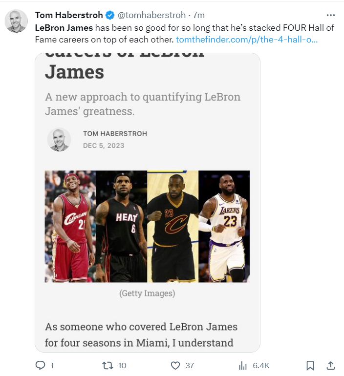 NBA记者汤姆-哈博斯特罗评价LBJ:勒布朗这么长时间以来一直都很优秀,他已经完成四个名人堂的生涯。
