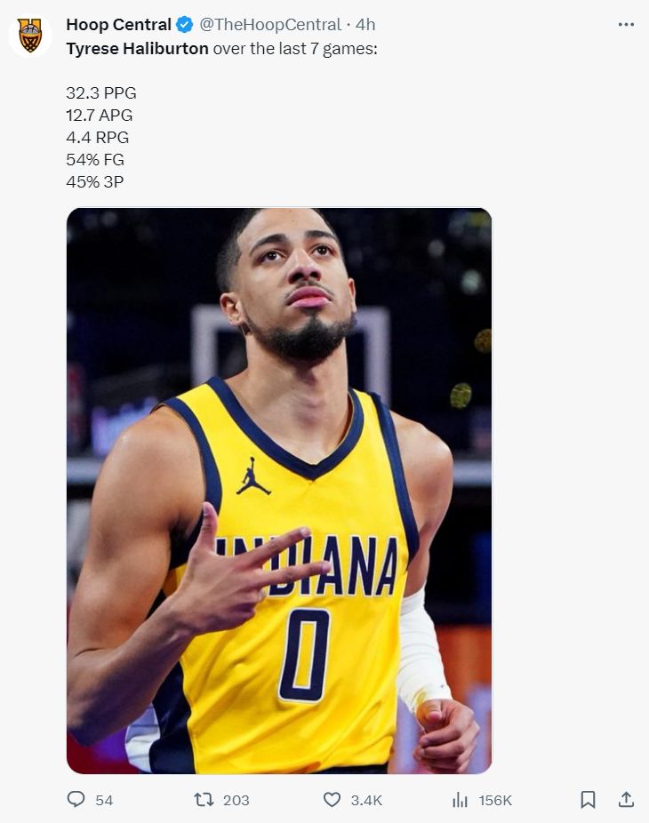 哈利伯顿在本赛季很出位,最近7场比赛场均32.3分12.7助攻4.4篮板,命中率54%,三分命中率45%,季中赛已经豪取6连胜,他前两场季中赛没有任何的一次失误连续创造NBA历史纪录。