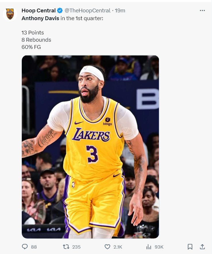 首节浓眉已经拿下13分8篮板1助攻的数据,他上一场对阵鹈鹕才拿16分而已,浓眉此役的进攻欲望很强。
