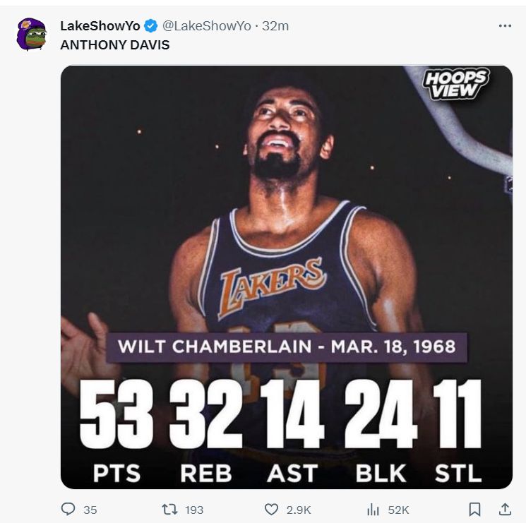 湖人媒体lakershowyo盛赞这个夜晚的戴维斯犹如张伯伦。