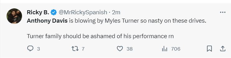 步行者球迷则对特纳的表现不满,他表示浓眉各种硬怼特纳,特纳根本无法限制浓眉,特纳的家人应该感到羞辱。