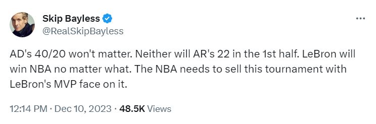 ‘金牌詹黑’赛后还是炮轰老詹:“浓眉40+20不重要,里夫斯半场22分也不重要,是NBA需要勒布朗赢下这场季中锦标赛,将他的头像印在MVP奖杯上。”