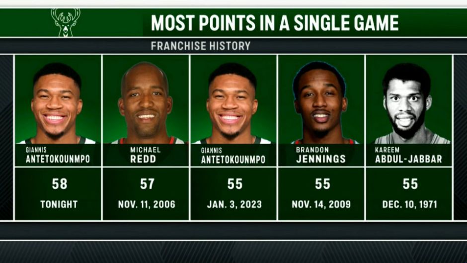 5、字母哥刷新雄鹿队史单场得分纪录。