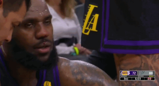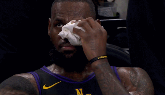 下半场,詹姆斯又被队友八村垒误伤,眼睛和鼻子都被打到,真是太倒霉了!这次,他的脸上出血了。