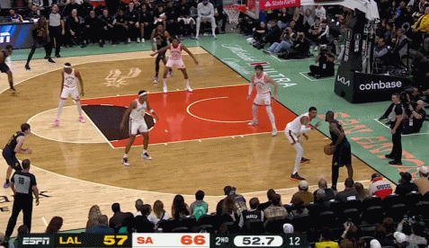 上半场,湖人的詹姆斯18分6篮板9助攻,里夫斯14分5篮板3助攻,普林斯和伍德各得10分。马刺的约翰逊17分,瓦塞尔15分,文班亚马6分8篮板2盖帽。