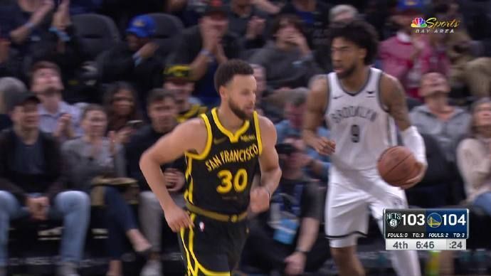 库里在第四节还剩8分40秒时,勇士97-99被篮网反超2分,库里替换保罗重新登场比赛。勇士随后继续以102-103落后篮网1分,库里开启属于他的进攻主宰比赛模式,库里先是上篮与中投连续得分,在篮网继续追平比分后,库里连中2记三分,随后还有大号两分命中。