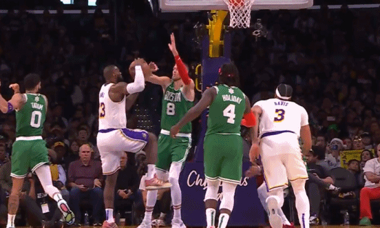 半场结束前1分32秒,詹姆斯追帽塔图姆,裁判响哨认为詹姆斯犯规。湖人发起挑战,但挑战结果是詹姆斯确实送出一个好帽,但一旁的普林斯犯规在先,所以塔图姆还是获得了两次罚球机会。
