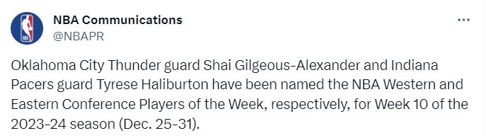 NBA官宣第10周周最佳:亚历山大当选 哈利伯顿生涯第二次当选