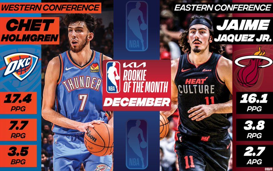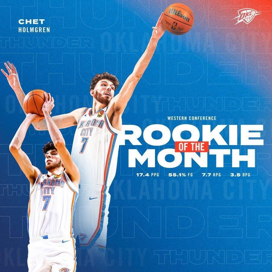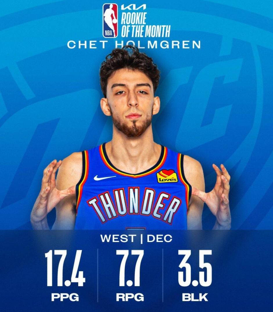 霍姆格伦再次力压文班亚马,当选了西部12月最佳新秀。12月的比赛中,霍姆格伦场均17.4分7.7篮板2.4助攻3.5盖帽,投篮命中率55.1%,三分命中率38.5%,罚球命中率78%。他出战的13场比赛,雷霆10胜3负。雷霆官方晒海报祝贺他获奖。