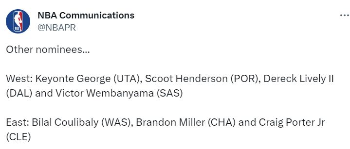 东部:阿德巴约、班凯罗和小瓦格纳、恩比德、哈利伯顿和特纳、米切尔、兰德尔、科比-怀特、德里克-怀特