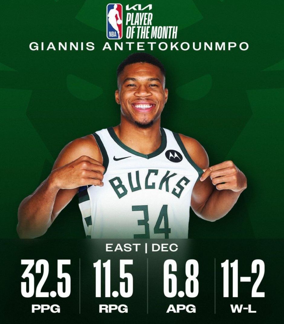 本赛季的第二次东部月最佳球员奖项,属于雄鹿的字母哥。这是字母哥生涯第10次当选月最佳球员。12月的比赛,字母哥场均32.5分11.5篮板6.8助攻1.3抢断0.9盖帽,投篮命中率61.6%,三分命中率17.6%,罚球命中率70.1%,帮助雄鹿获得11胜2负的佳绩。雄鹿官方晒图祝贺字母哥获奖。