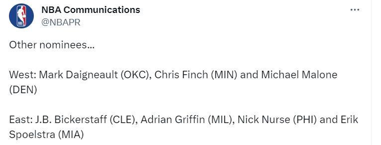 12月的月最佳主教练,属于凯尔特人的马祖拉与快船的泰伦-卢。凯尔特人的12月战绩是12胜2负,是12月东部胜率最高的球队;快船的12月战绩是11胜2负,是12月西部胜率最高的球队。