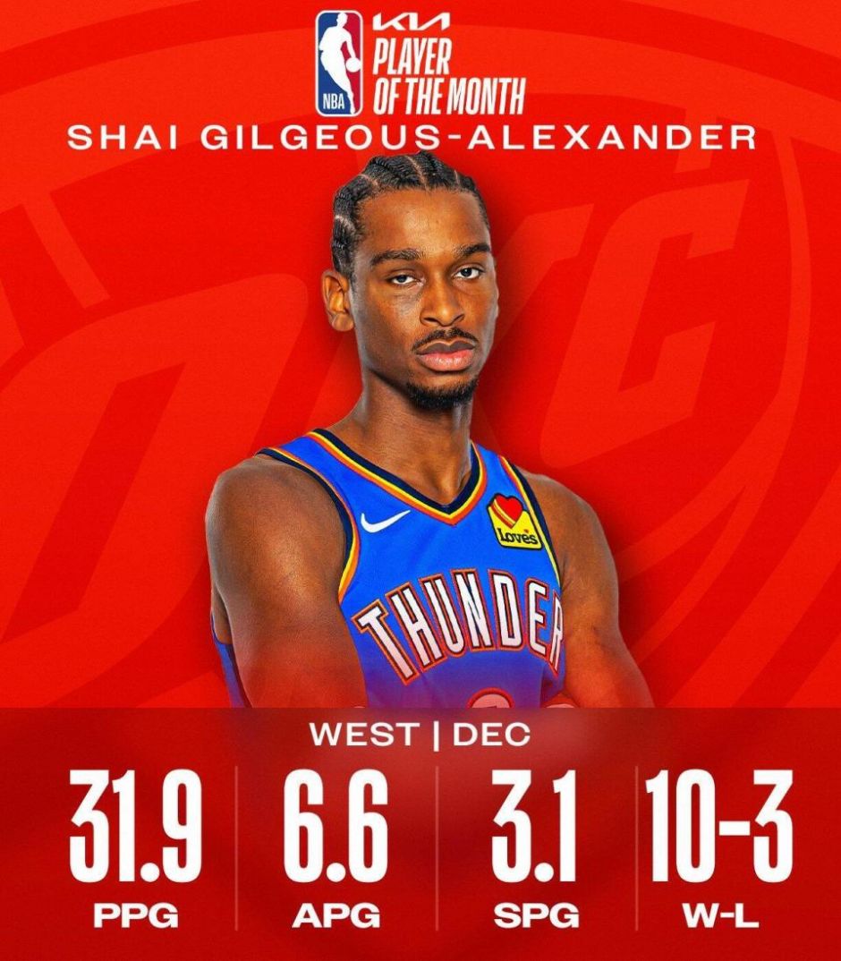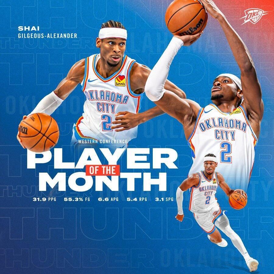 本赛季的第二次西部月最佳球员奖项,属于雷霆的亚历山大。这是亚历山大生涯首次当选月最佳球员。12月的比赛,亚历山大场均31.9分5.4篮板6.6助攻3.1抢断0.7盖帽,投篮命中率55.3%,三分命中率26.8%,罚球命中率88.7%,帮助雷霆取得10胜3负的佳绩。雷霆官方晒图祝贺亚历山大获奖。