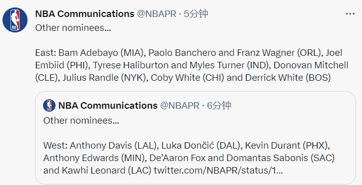 西部:浓眉、东契奇、杜兰特、爱德华兹、福克斯和萨博尼斯、莱昂纳德