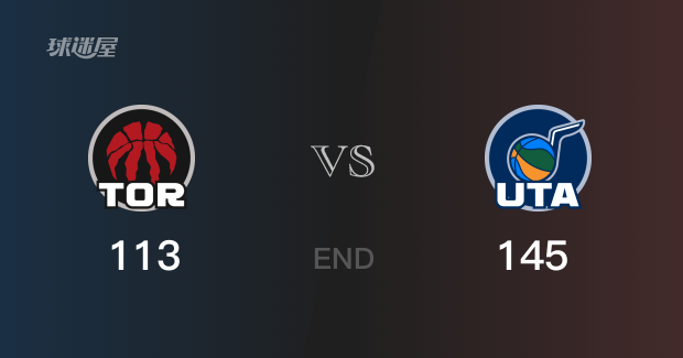 全场比赛结束,最终爵士以145-113击败猛龙,成为获胜方。爵士球员马尔卡宁砍下全队最高22分,外加9篮板2助攻1抢断、克拉克森21分1篮板5助攻、塞克斯顿20分2篮板5助攻2抢断,他们是爵士队里得分最高的三名球员。