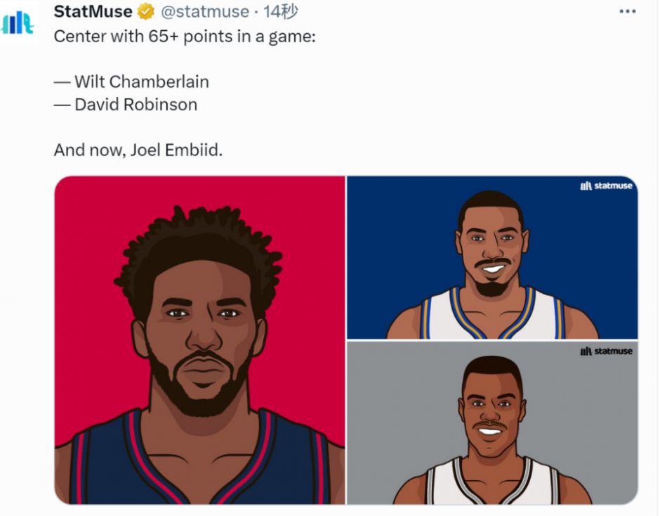 13.中锋历史单场超65+只有三人:张伯伦、罗宾逊、恩比德;
