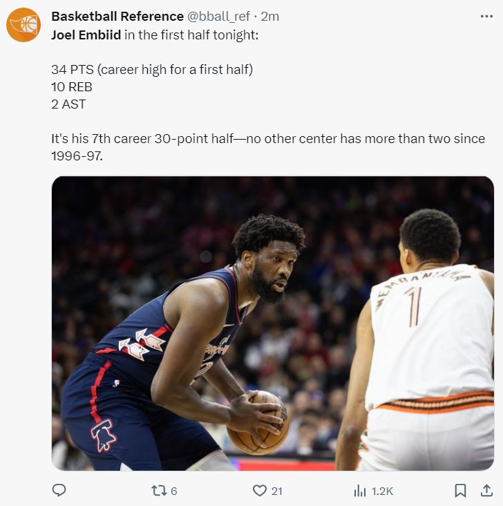 12.恩比德刷新个人职业生涯新高得分,此前是59分;