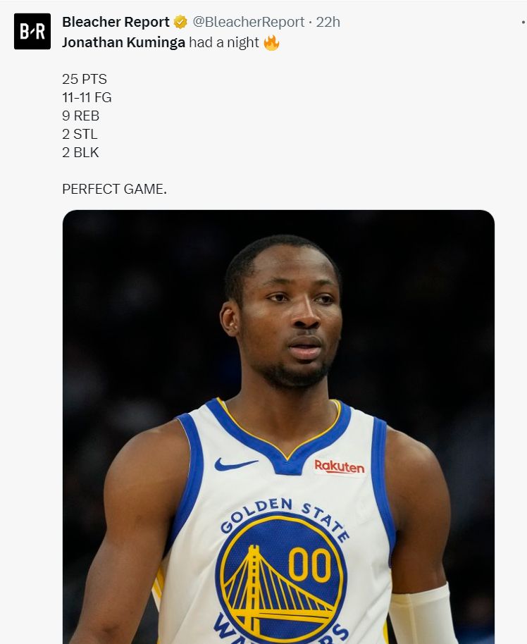库明加在背靠背的第一场11中11,拿下25分9篮板2抢断2盖帽,成为队史克里斯-穆林后首位11中11的球员;也是最近30年第二位单场至少出手9+全中的球员;