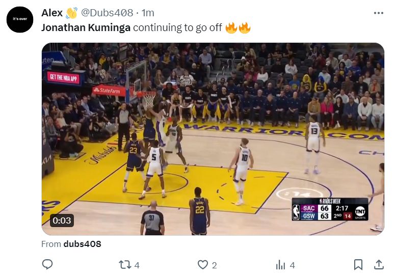 此前的四场比赛库明加场均24.3分+命中率66.3%,此役他的进攻势头依旧很猛烈,首节3分钟里就出手3次拿下2分2助攻,第二节他是勇士追分的超级功臣,单节9分钟里6中4,三分1中1,罚球4中3,拿下12分2篮板1助攻1抢断,半场9中5拿14分3助攻2篮板1抢断,得分仅次于库里。