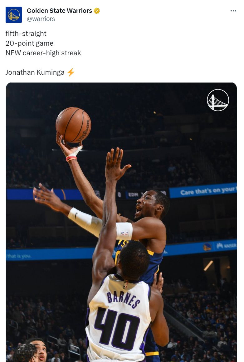 第三节库明加只打了6分钟,三分1中1拿下3分,国王对他的防守更严密了一些,好在先发的四人开始发威没有让分差拉开。末节库明加短短6分钟里4中3拿下7分,他的得分再度上20+,他已经连续五场比赛拿下20+,他也继续帮助勇士紧咬比分,决胜时刻库明加关键2+1续命,还剩1分10秒库明加暴扣缩小到1分,35秒库明加暴扣反超,但库明加22秒想要出手被巴恩斯大帽,随后库里低级失误葬送比赛。