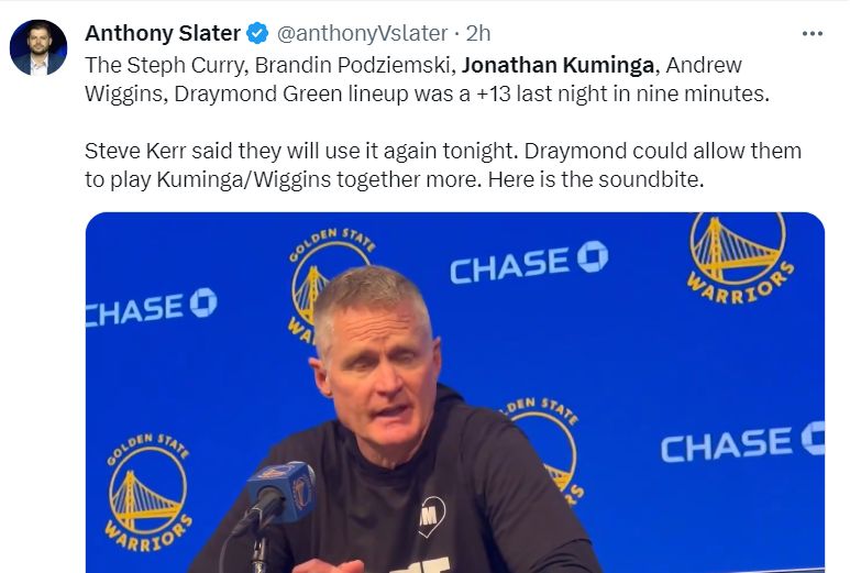 赛前科尔明确表示:库明加、库里、波杰姆斯基、威金斯、追梦五人9分钟内+13,背靠背第二场会继续沿用这套阵容,轮换阵容也会多让追梦、威金斯、库明加一起上。