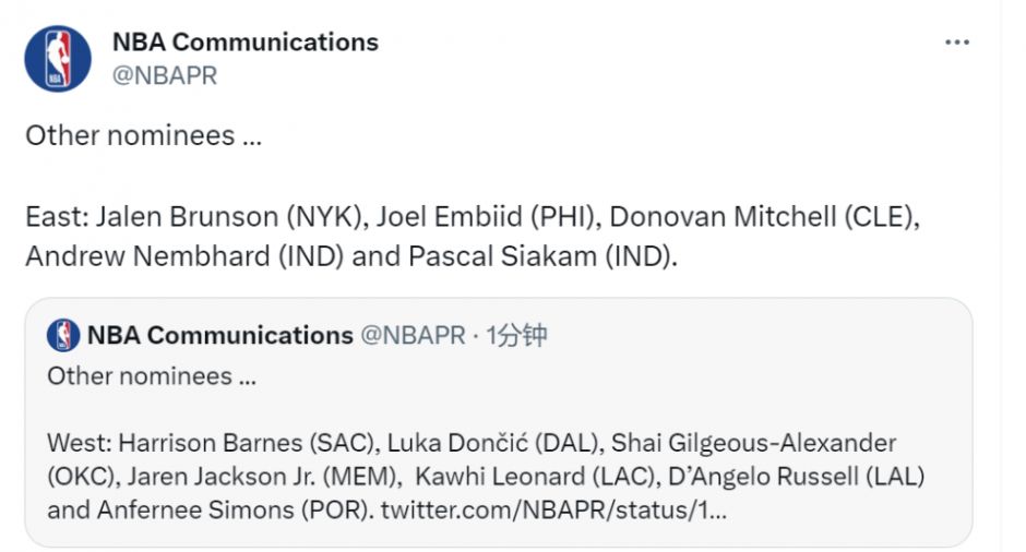 西部:巴恩斯、东契奇、亚历山大、贾伦-杰克逊、莱昂纳德、西蒙斯