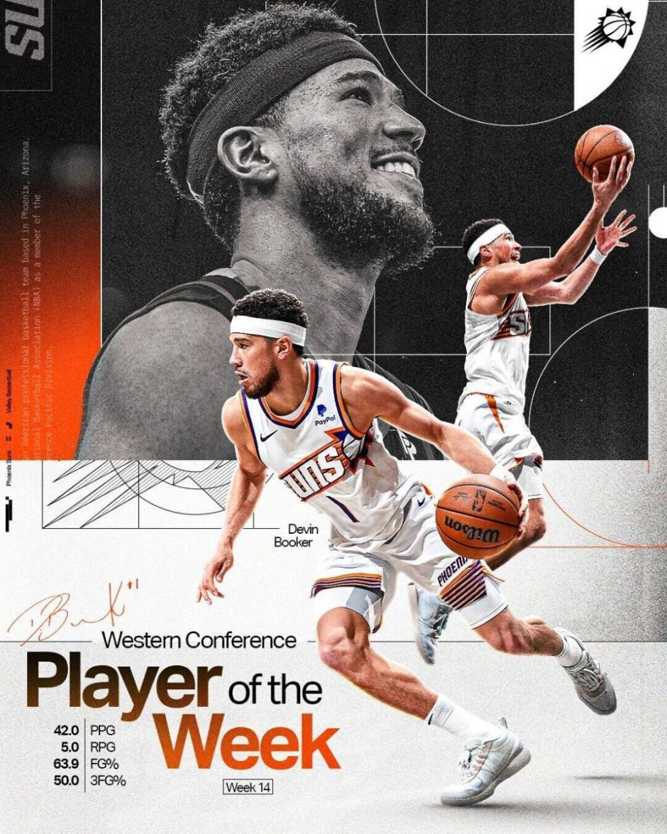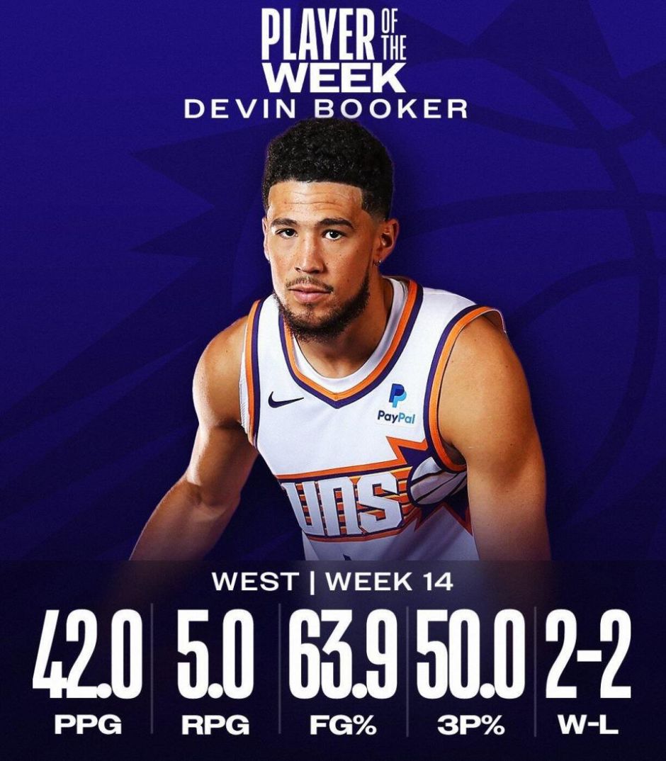 布克上周场均42分5篮板3.8助攻1.3抢断1盖帽,投篮命中率63.9%,三分命中率50%,帮助太阳取得2胜2负的战绩,不过,他砍下62分和44分的两场比赛,太阳都输了。太阳官方晒出海报,祝贺布克当选周最佳。