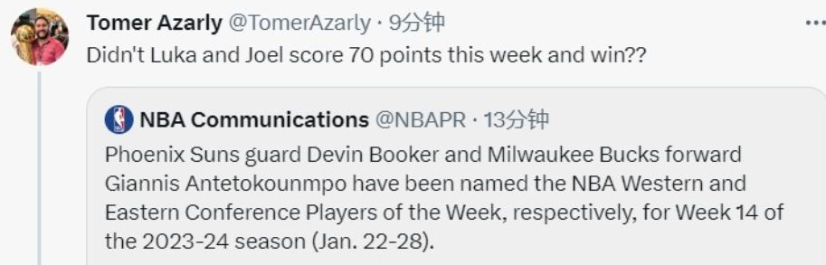 快船记者Azarly质疑布克当选:“东契奇和恩比德不是砍70+且赢球了?”随后他还表示:“布克得分高但连续空砍,真有点搞笑。”