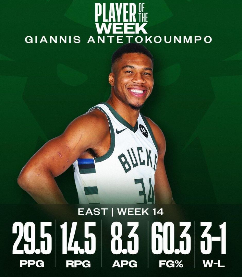 字母哥上周场均29.5分14.5篮板8.3助攻1.5抢断1.3盖帽,投篮命中率60.3%,三分命中率42.9%,率领雄鹿取得3胜1负的成绩。雄鹿官方晒出海报,祝贺字母哥当选周最佳。