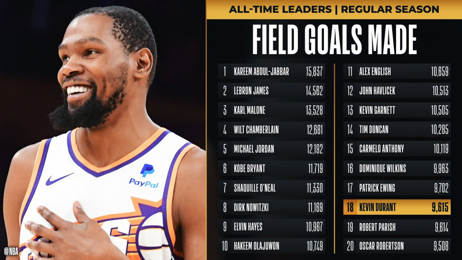 至此杜兰特NBA生涯运动战进球数来到9615个,超越名宿帕里什,升至历史第18,前面一位是尤因的9702个。