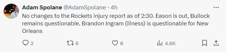 这支休斯顿火箭队还是没有成为完全体,塔里-伊森这位锋线防守悍将连续缺席第24场比赛,根据乌度卡所说他遭遇应力性骨折的大伤,不排除赛季报销的可能性。好在范弗利特与白魔伤愈复出,开场范乔丹就命中三分帮助火箭打出6-2的小高潮,不过这支火箭最不擅长的就是打客场比赛,很快就被锡安就冲垮了防守阵型,申京在篮下也无法限制瓦兰,首节打完火箭27-31落后鹈鹕。