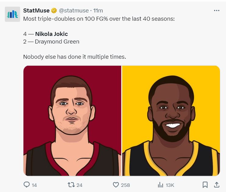 约基奇也成为过去40个赛季以100%命中率拿下三双最多的球员,他有4次,追梦有2次。