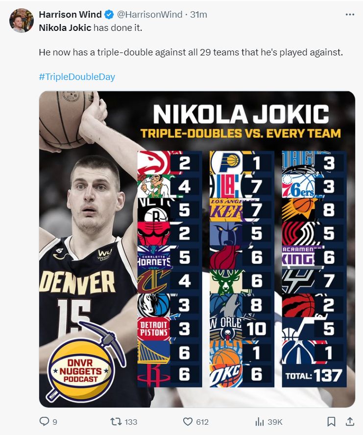 NBA官方写道:凭借对阵奇才的三双,约基奇已经创造生涯对阵所有球队都拿下三双的纪录,他成为威少、詹姆斯后历史第三位完成这一纪录的成员。