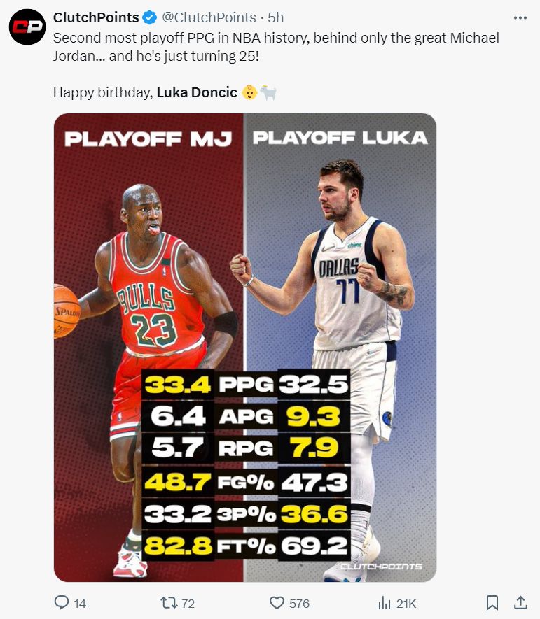 美媒晒出东契奇与乔丹生涯季后赛的数据,他的场均得分仅次于乔丹,篮板、助攻、三分命中率还超过乔丹,祝贺东契奇生日快乐。