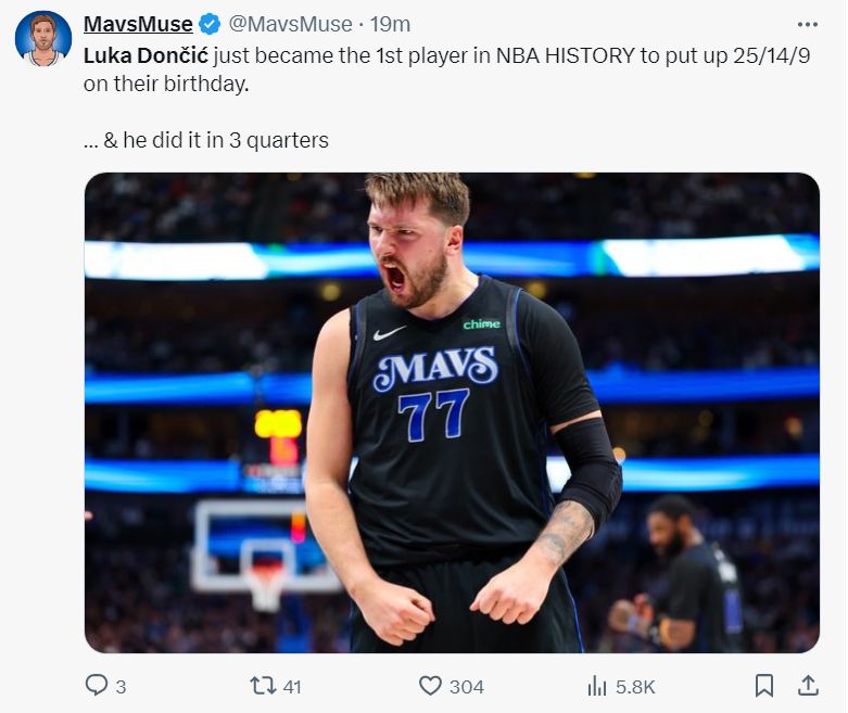 三节打完东契奇25+14+9,他成为历史首位在生日夜三节拿下25+14+9的球员。
