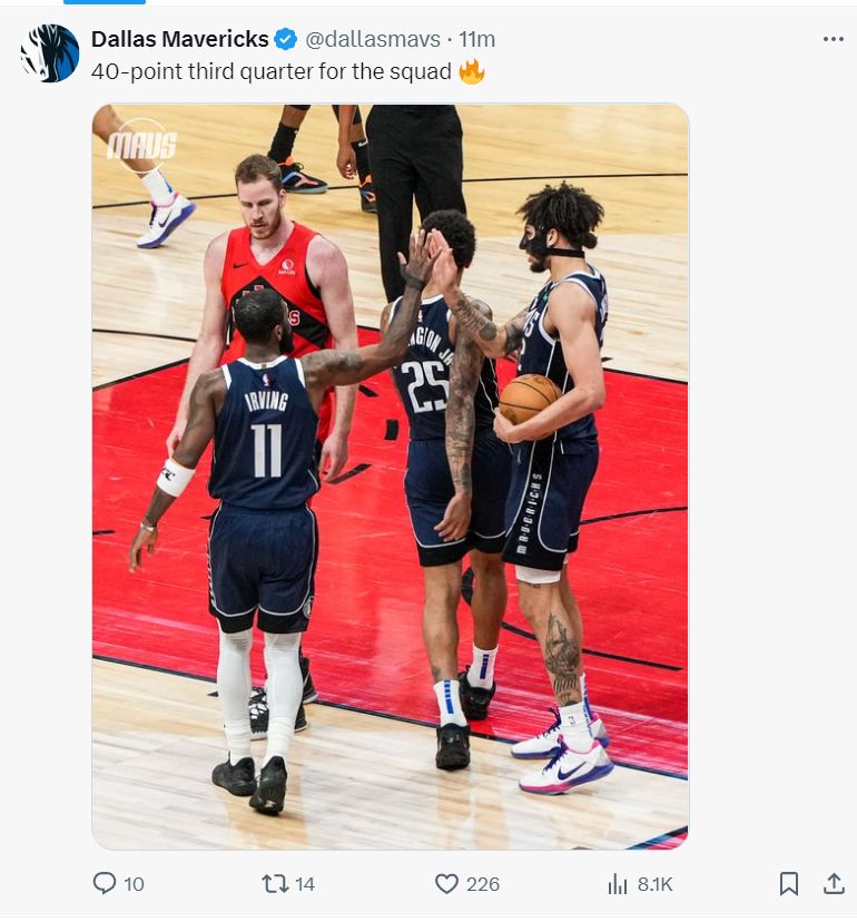 末节东契奇场下休息时欧文一人连拿15分帮助独行侠继续压制猛龙,随后东契奇很快完成30+三双,猛龙奋力追分缩小到9分,可包夹东契奇他传给华盛顿三分命中直接杀死比赛。全场比赛东契奇23中11拿下30分16助攻11篮板。