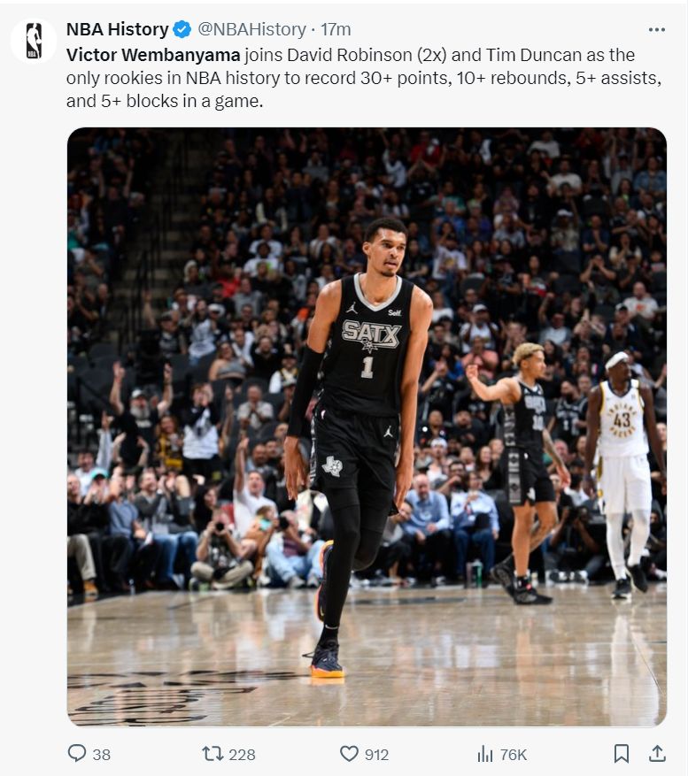 这场比赛文班亚马又一战创造多项纪录:1.文班亚马成为NBA历史上第三位,单场30+10+5+5帽的新秀,其余两人是大卫罗宾逊与邓肯。
