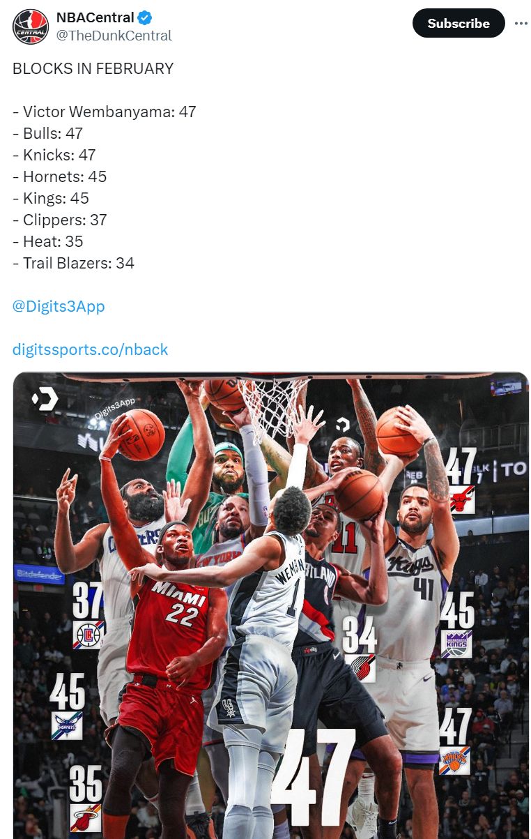 7.文班亚马二月份47次盖帽超过或等于联盟7支球队;