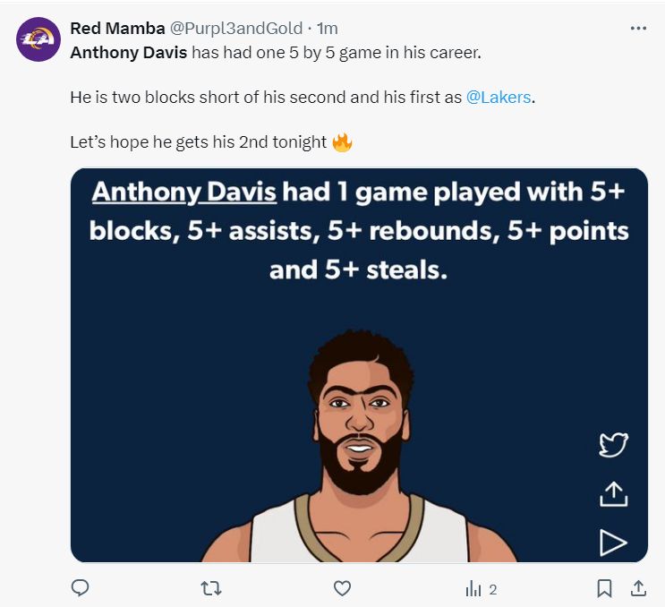 湖人媒体还写道:浓眉生涯只有一场5抢断+5盖帽的比赛,这场比赛他距离5X5只剩下2个盖帽而已很有希望。
