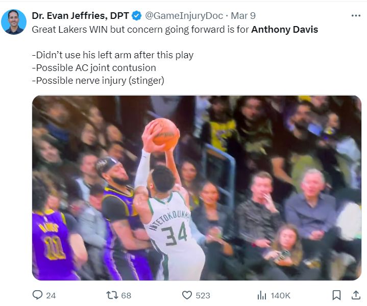 安东尼-戴维斯在对阵雄鹿一战中被扬尼斯撞伤了右肩,不过湖人官宣MRI检测后表示不是骨骼的问题是一个肌肉问题,这一场对阵森林狼的比赛他也决定带伤出战。