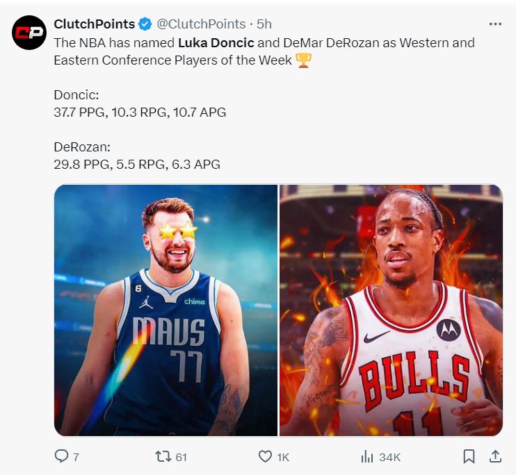 这场比赛之前独行侠的东契奇与公牛的德罗赞分别被评为周最佳,东契奇37.7+10.3+10.7,德罗赞29.8+5.5+6.3,这场周最佳的对决,东契奇又继续延续自己的三双。