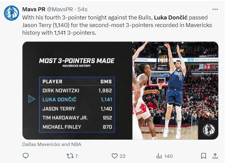 2.东契奇在队史三分命中数已经超过杰森-特里升至队史第二仅次于诺天王;