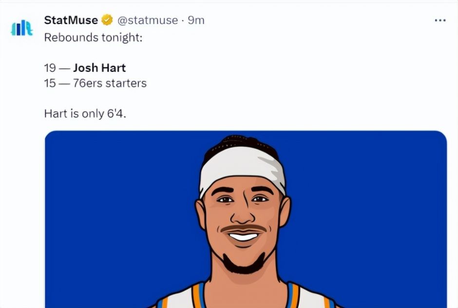 哈特这场比赛的数据过于炸裂,毕竟他是一个6尺4的后卫竟然拿下了19篮板+三双啊。