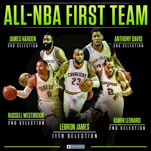 24直播网网 5月19日 NBA本赛季常规赛最佳阵容已经公布,骑士当家球星詹姆斯毫无疑问再次入选第一阵容,同时入选第一阵的还有哈登、威少、莱昂纳德和浓眉。本赛季,哈登是唯一一个全票满分当选的一阵球星,詹姆斯和威少都获得99张一阵和1张二阵选票,遗憾没能全票入选。