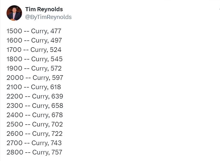 不过,雷诺兹也指出邓罗要破库里的纪录就太难了,因为库里生涯前三个赛季都只有场均命中2个三分左右,但从第4年开始他的场均三分命中数开始迅速提升,特别是2015-16赛季至2023-24赛季之间,除了赛季很快报销的2019-20赛季,其他赛季的场均三分命中数都在4-5个左右。邓罗生涯至今的场均三分命中数是2.9个。