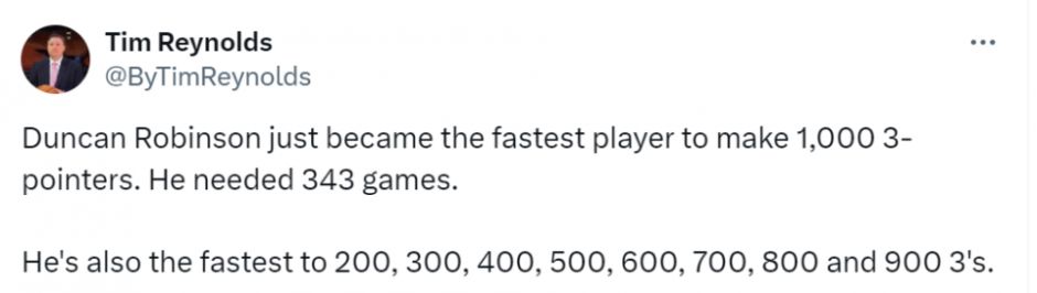 历史最快!邓肯-罗宾逊343场命中1000记三分:库里未来纪录仍难以动摇