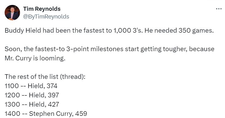 接下来,他将继续冲击新的三分纪录。雷诺兹指出最快完成1100记、1200记和1300记三分的球员都是希尔德,而从1400记三分到3600记三分,最快完成的纪录都属于库里。