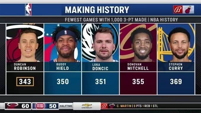 数据显示,史上命中1000记三分所用场数最少的历史前五依次是:邓罗、希尔德、东契奇、米切尔、库里。